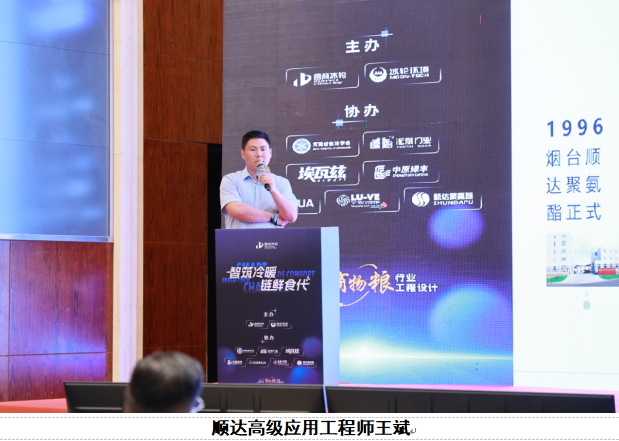 顺达高级应用工程师王斌作《绿色发泡・高抗阻燃——顺达聚氨酯冷库保温全体系解决方案》分享,介绍高性能保温材料在低碳冷库中的应用价值。